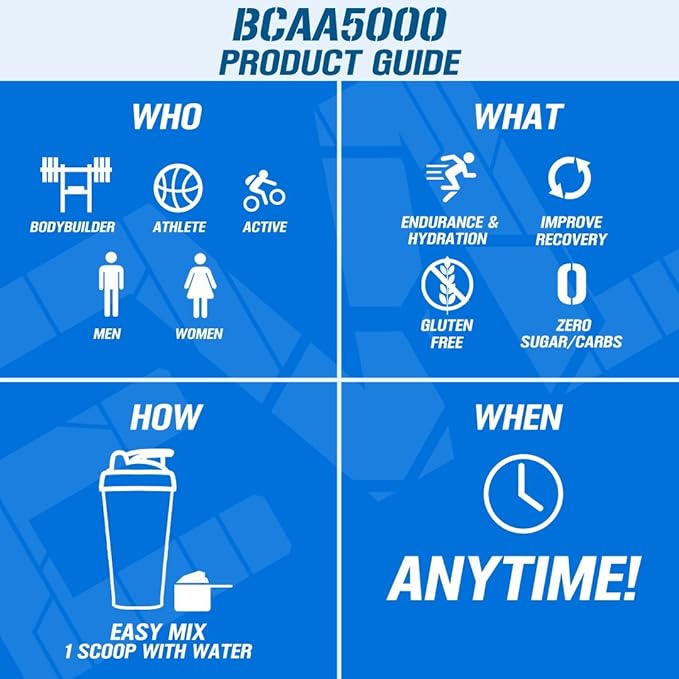 - Optimized Formula - BCAA5000 is packed with 5 grams of BCAA amino acids in the ideal 2:1:1 ratio to support your workout and fitness goals by enhancing muscle recovery endurance and performance