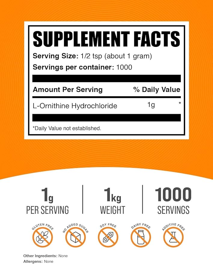 - Maximize your Potential: Enhance your active lifestyle with our L-Ornithine HCl powder, designed to support your strength and performance goals. Each serving delivers a substantial 1g dose, catering to both fitness enthusiasts looking to push their limits.