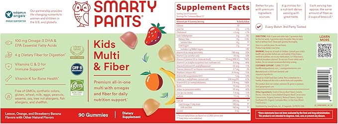SmartyPants Kids Multivitamin Gummies and Fiber Supplement: Vitamin D3, C, Vitamin B12, B6, A, Zinc, Biotin, Inositol, Fiber Gummies, Three Fruit Flavors, 90 Count (22 Day Supply)