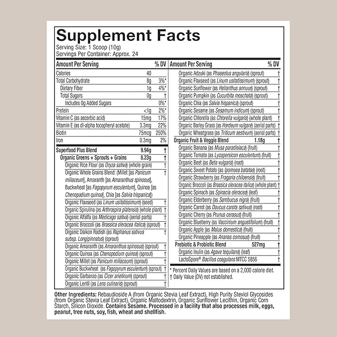 - Support Your Lifestyle Without Compromise : Nourish your body with the power of 39 superfoods and probiotics – all in one clean, convenient scoop. This nutrient-packed powder is easy-to-digest, making it effortless to fuel your body.