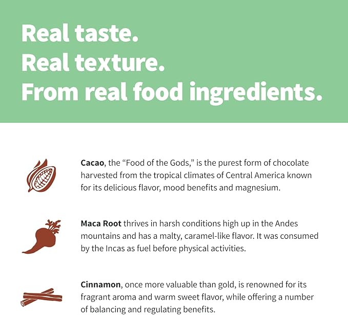 - SUPERFOOD-PACKED & DELICIOUS - Potent blend with antioxidant-rich cacao and adaptogenic maca; a creamy texture, rich real flavor and full-bodied sweetness with no 'fake' aftertaste; a natural source of energy, endurance and antioxidants.