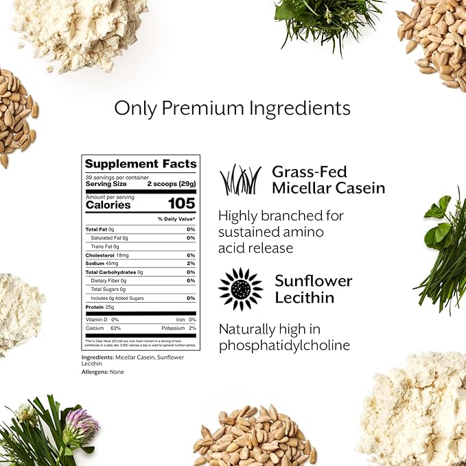- Whole Food-Based Ingredients: Made of grass-fed micellar casein and sunflower lecithin (naturally high in phosphatidylcholine). That’s it.