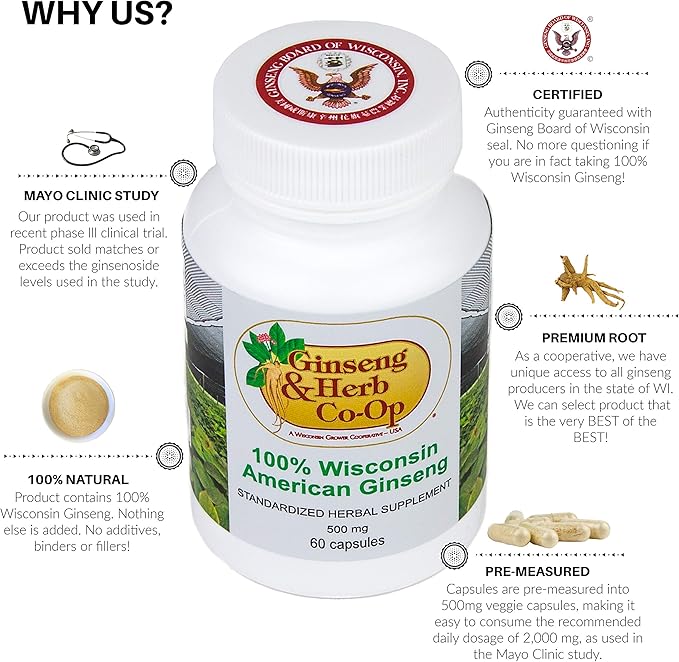 100% Pure Wisconsin American Ginseng Capsules - 500mg. Authentic Panax Quinquefolius. Potent Ground Ginseng Root - No Fillers, Binders or Other Additives.