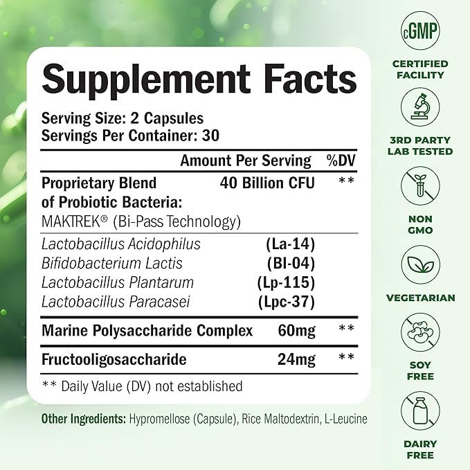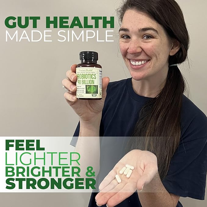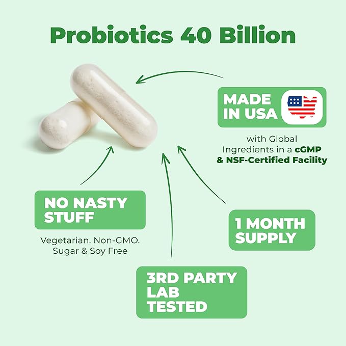 - Product Benefits : Digestive & Gut Health Support - This high-potency probiotic 40 billion CFU formula helps maintain digestive balance by promoting a healthy gut microbiome. Supports regularity, eases occasional discomfort, and enhances daily digestive comfort for adults of all ages.*, Easy-to-Swallow, Clean-Label Capsules - Encased in scent-free capsules with no aftertaste, this formula is Vegetarian, Non-GMO, Dairy-Free, Sugar-Free, and Soy-Free.*, Immune Support & Nutrient Absorption - Packed with clinically studied Bifidobacterium lactis, part of the Bifidus probiotics group, this blend helps optimize immune function while supporting the breakdown and absorption of nutrients - ideal for supporting optimal health systems and everyday vitality.*, Purity, Potency & USA Manufacturing Standards - Made in the USA in a cGMP and NSF-certified facility with globally sourced ingredients. Each batch of these 40 billion probiotics is third-party tested for quality, so you can supplement with confidence.*, Stress Balance, Travel & Antibiotic Recovery Support - Trusted for use during diet changes, seasonal shifts, or post-antibiotic regimens, these probiotics (probióticos) support digestive resilience and immune health when your system needs it most - at home or on the go.*, Trusted for Long-Term Wellness - Designed for consistent use as part of your wellness routine. Whether you’re aiming for active aging, digestive comfort, or supporting your gut microbiome, this supplement delivers daily support without compromise.* Digestive & Gut Health Support - This high-potency probiotic 40 billion CFU formula helps maintain digestive balance by promoting a healthy gut microbiome. Supports… See more