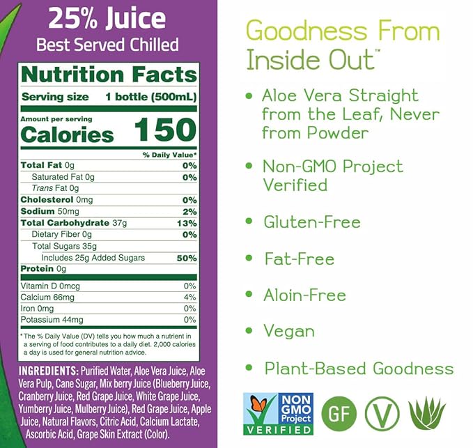 - FARM-TO-BOTTLE DELICIOUSNESS: Great flavor comes from using real fruit and vegetable juices as well as organic and other fine ingredients combined with real, fresh aloe juice and pulp; No artificial anything