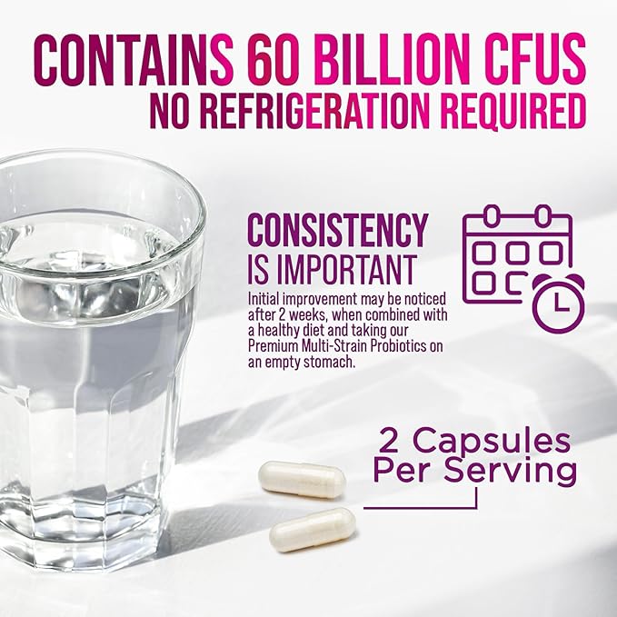 - Survives the Gut: With a shelf-stable bottle, acid-resistant capsules, and 60 Billion Colony forming units (CFU), our unique probiotic is designed to survive the gut for maximum digestive benefits