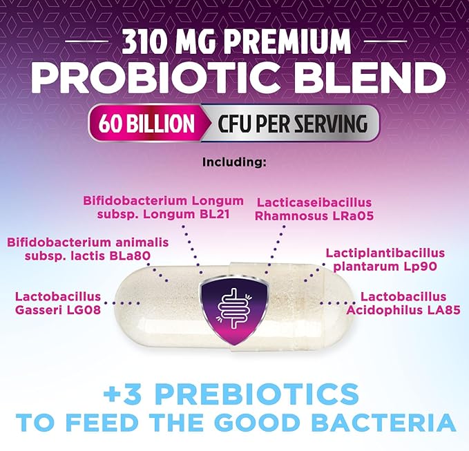 - Probiotics for Digestive Health: Take 2 capsules daily to support a diverse microbiome with 60 Billion CFU from 10 unique probiotic strains + a complete prebiotic blend