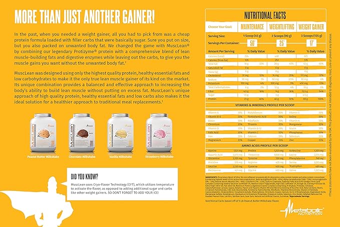 Metabolic Nutrition - Musclean - Milkshake Weight Gainer, Whey High Protein Meal Replacement, Maintenance Nutrition, Low Carb, Keto Diet, Digestive Enzymes, Vanilla, 2.5 Pound (25 ser)