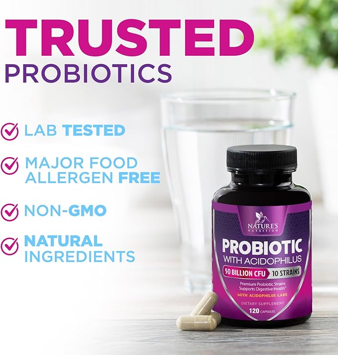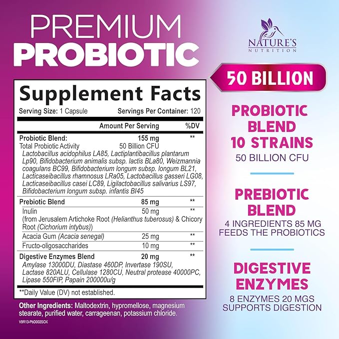 - Probiotics for Women & Men: 50 billion cfu premium adult probiotic supplement complete with prebiotics from Nature's Nutrition take 2 capsules daily supports digestive health good gut formulated with acidophilus lactobacillus reuteri bifidobacterium enzymes pre pro best biotics best natural vaginal support occassional constipation bloating