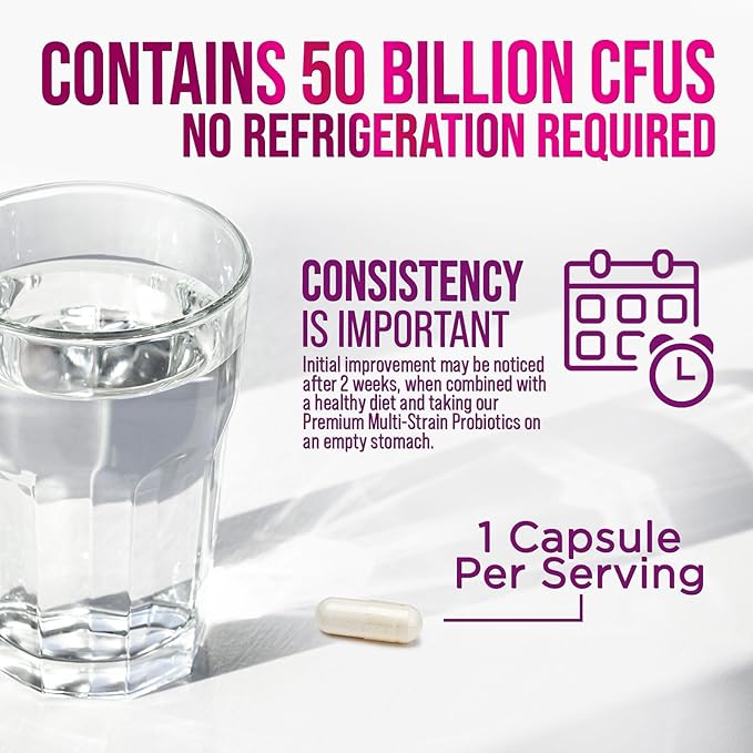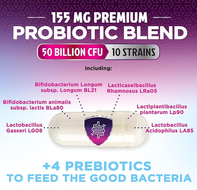 - Probiotics for Digestive Health: Take 1 capsule daily to support a diverse microbiome with 50 Billion CFU from 10 unique probiotic strains + a complete prebiotic blend