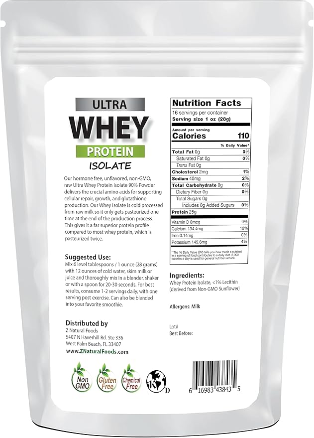 Z Natural Foods Ultra Whey Protein Isolate Powder - Pure, Unflavored, Unsweetened Whey Protein Powder - Flavorless Whey Isolate with Vital Proteins for Fitness, Sports Nutrition, Immune Support, 1 lb