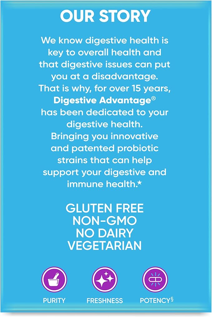 - Digestive Advantage Daily Probiotic capsules are Gluten Free, Non-GMO, No Dairy, Vegetarian, and are guaranteed for Purity, Freshness, Potency.