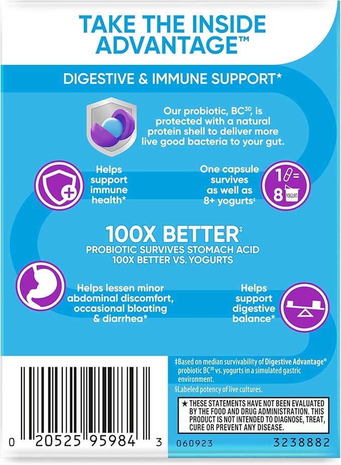 - *These statements have not been evaluated by the Food and Drug Administration. This product is not intended to diagnose, treat, cure or prevent any disease. Based on median survivability of Digestive Advantage Probiotic BC30 vs. yogurts in a simulated gastric environment.