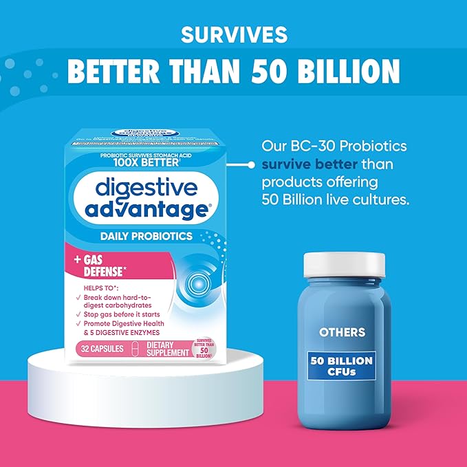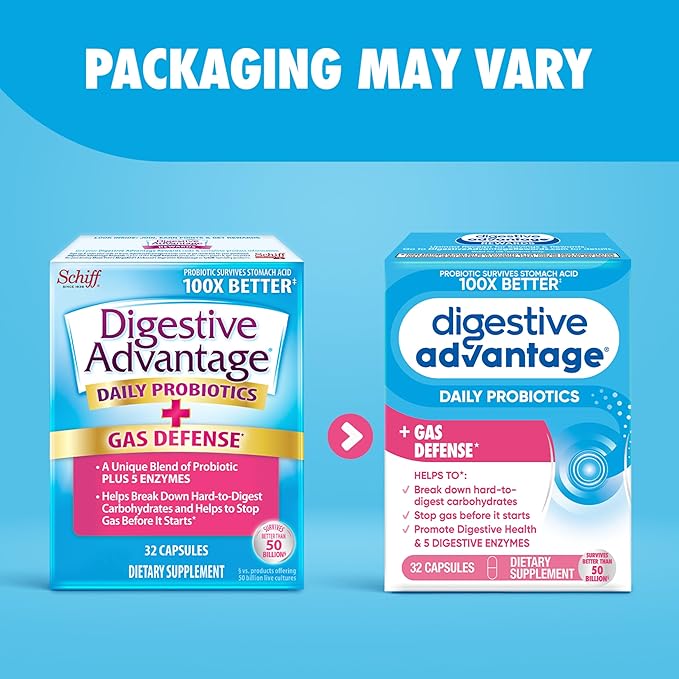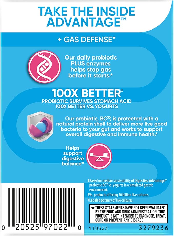 - DIGESTIVE ENZYMES + DAILY PROBIOTICS FOR WOMEN & MEN: Digestive Advantage Daily Probiotics + Gas Defense (& 5 Digestive Enzymes) is crafted to help support your digestive health and immune health.*