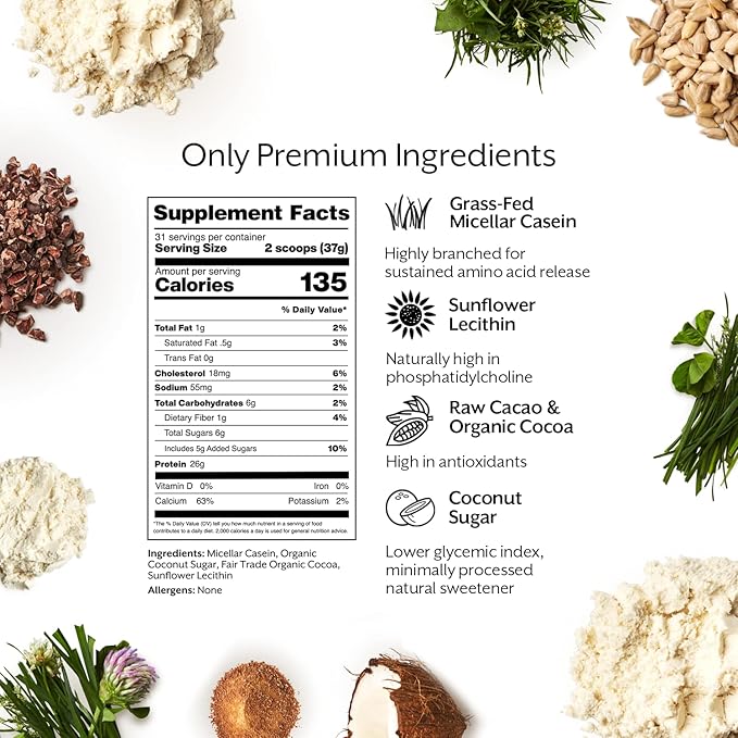 - Whole Food-Based Ingredients: Made of grass-fed micellar casein, sunflower lecithin (naturally high in phosphatidylcholine), raw cacao and organic cocoa (high in antioxidants), and coconut sugar (lower glycemic index, minimally processed natural sweetener). That’s it.