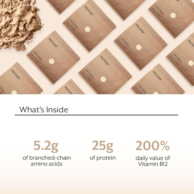 - What’s Inside: Our Vegan Protein Powder is packed with 25g of protein and 5.2g of branched-chain amino acids per serving. 200% of your Daily Value of Vitamin B12 in every serving.