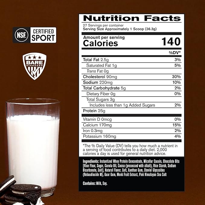 BARE PERFORMANCE NUTRITION, BPN Whey Protein + Casein Protein Powder Blend, Milk N' Cookies, 25g Protein per Serving Supports Lean Muscle Recovery, 27 Servings, Third Party Tested