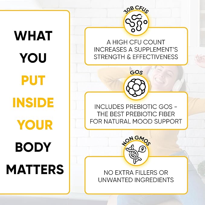 - MOOD ISSUES? IT'S IN YOUR GUT!: Uncover the profound connection between your gut health and mood. Our Mood Probiotic is a carefully formulated solution that addresses both aspects, leveraging powerful bacterial strains and prebiotic GOS in harmony for a holistic approach to well-being.