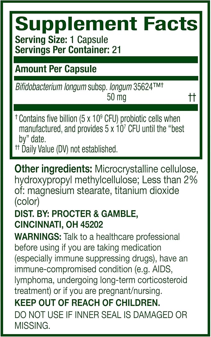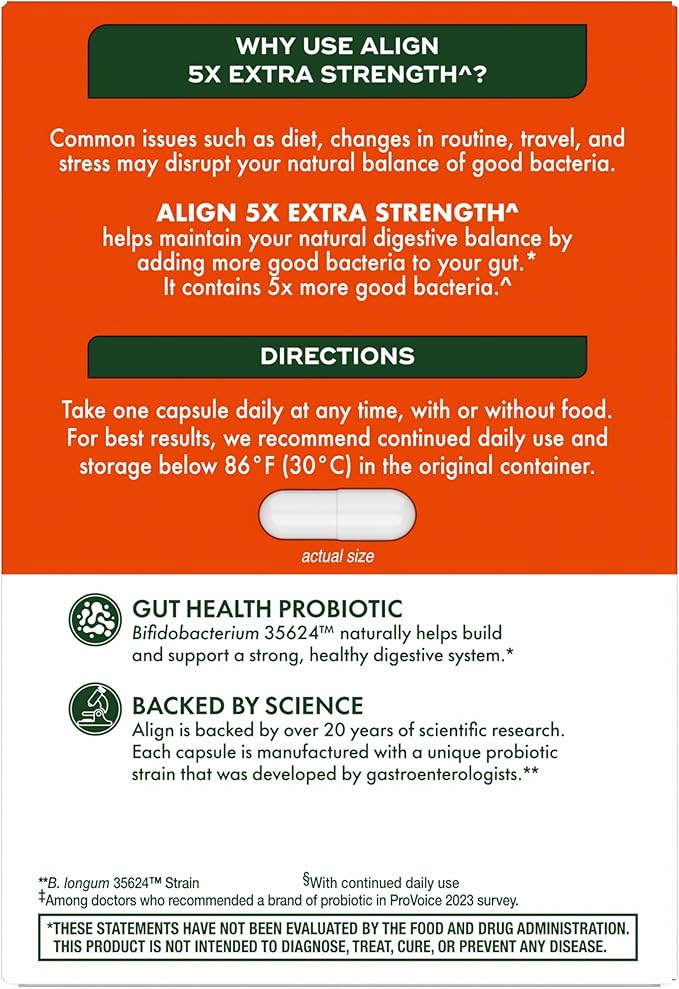 - TRY ALIGN EXTRA STRENGTH: Just one capsule contains 5x the active CFUs vs. Align capsules; the pure-strain probiotic bacteria Bifidobacterium 35624 TM adds good bacteria to support digestive balance and helps promote normal bowel function.*