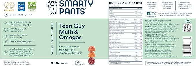 SmartyPants Teen Guy Formula, Daily Multivitamin Gummies: Vitamins C, B12, K, Zinc, & Biotin for Immune Support, Energy, Skin & Hair Support, Assorted Fruit Flavor, 120 Gummies (30 Day Supply)