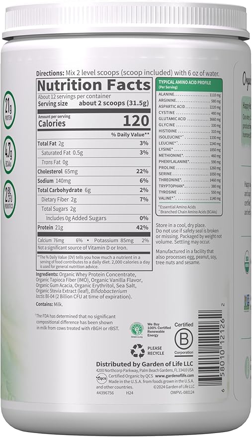 Garden of Life Grass Fed Whey Protein Powder Vanilla - 21g Protein for Women & Men + Probiotics - 12 Servings - Gluten Free, Non GMO, Kosher, Humane, RBST & rBGH Hormone Free