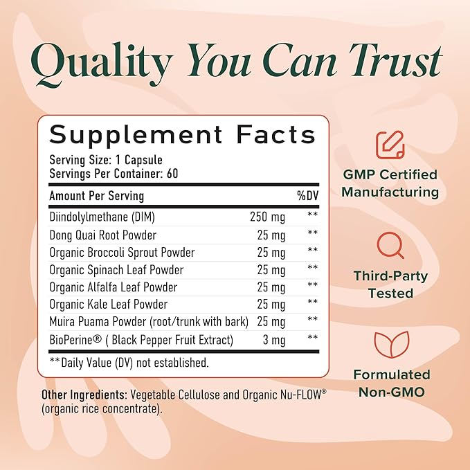 - POWERFUL DIM COMPLEX: Formulated with DIM 250mg, this DIM Complex for women contains organic Spinach, Alfalfa, Kale, and Broccoli Sprouts, and BioPerine for enhanced absorption. With more veggie power than other formulations, this is the DIM supplement BioPerine women prefer.