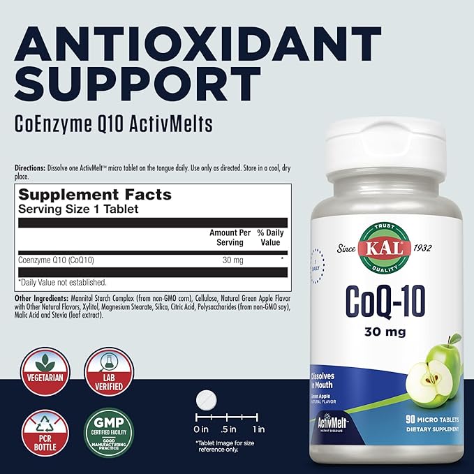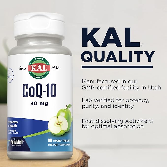 KAL CoQ10 30mg, Antioxidant Formula, CoEnzyme Q10 Supplement for Heart Health and Cellular Energy Support, Fast-Dissolving ActivMelts, Vegetarian, Natural Green Apple Flavor, 90 Serv, 90 Micro Tablets