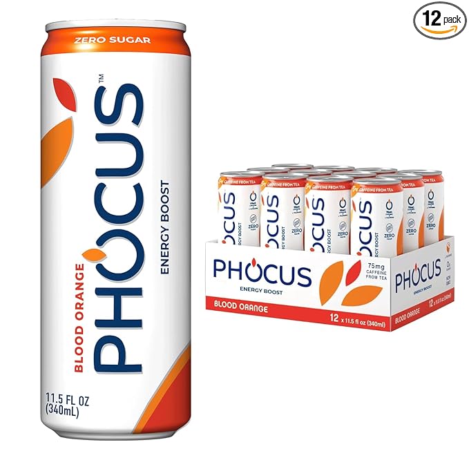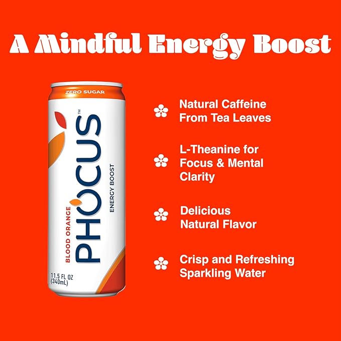PHOCUS Caffeinated Sparkling Water, Blood Orange, 75mg Natural Caffeine Plus L-Theanine, Zero Sugar, Zero Calories, No Artificial Sweeteners, 11.5 fl oz Cans (Pack of 12)