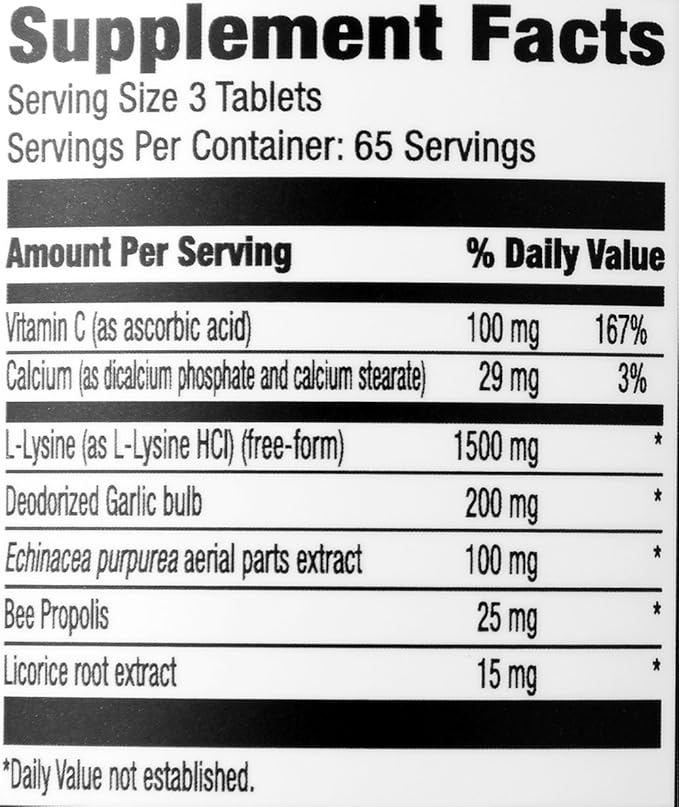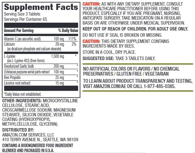 Amazon Elements Lysine Complex with Vitamin C for Immune Health Support, Vegetarian, 65 Servings, 195 Count (Packaging may vary)