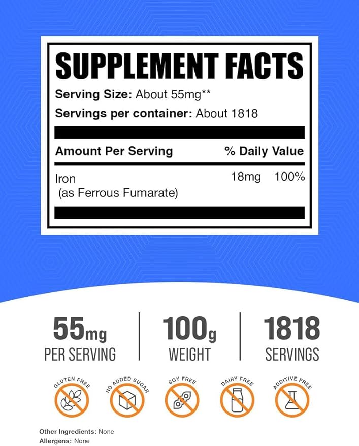 BulkSupplements.com Ferrous Fumarate Powder - Essential Mineral, Iron Supplement for Men and Women - Gluten Free, 55mg per Serving, 100g (3.5 oz) (Pack of 1)