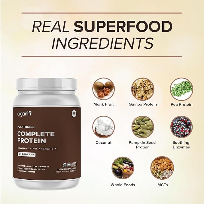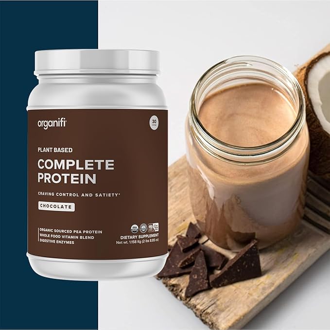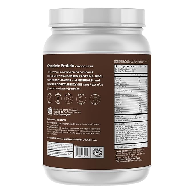 Organifi Complete Protein Chocolate Flavor - Organic Vegan Plant Based Protein Powder with Digestive Enzymes - 30 Day Supply - No Soy, Dairy, or Gluten