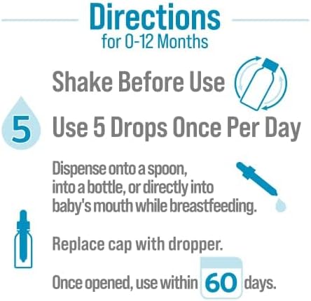 - SAFE & EASY TO TAKE: Shake before use; dispense 5 drops once a day onto a spoon, into a bottle or directly into baby’s mouth while breastfeeding; replace cap with dropper; use within 60 days once opened, 1-month supply.