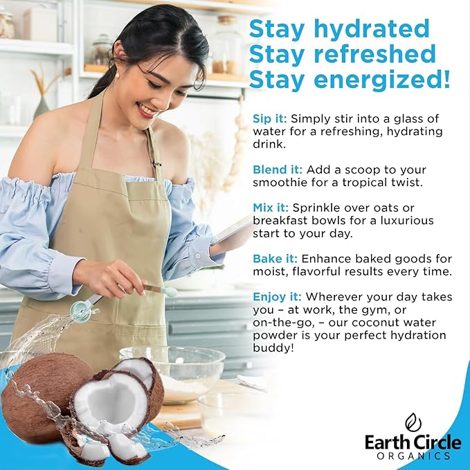 - ✅ RECOMMENDED SERVING & USAGE: Mix 1.5 Tbsp of Pure Coconut Water Powder into 8oz of water for a refreshing and hydrating drink. This unsweetened, electrolyte-rich powder dissolves instantly with no clumps, delivering 1 gallon of pure hydration per pack. Safe to swallow and easy to digest, it's perfect for smoothies, baked goods, or on-the-go hydration—whether you're at the gym, outdoors, or staying energized at work. Just add water and enjoy!