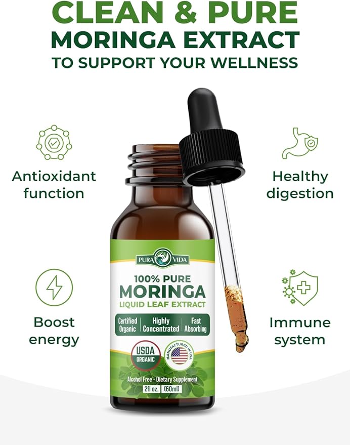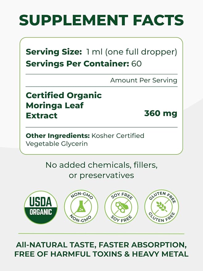 - Organic Moringa Extract Liquid: Experience the full power of nature with our USDA Organic Certified Moringa Extract Liquid Organic, a highly concentrated and bioavailable formula derived from single-origin Moringa leaves, surpassing the nutrient density of traditional moringa powder organic.