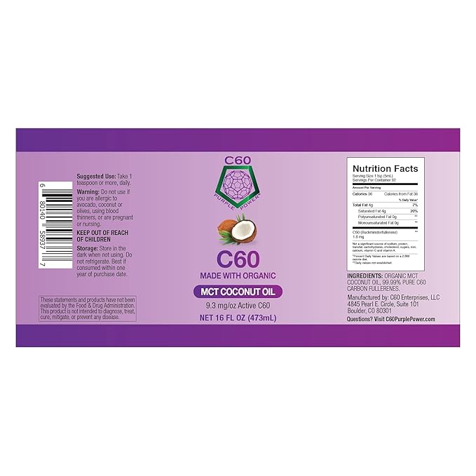 C60 Purple Power Organic MCT Coconut Oil, Organic Cold-Pressed Coconut Oil, 99.99% Pure C60 Carbon Fullerenes (16 oz)