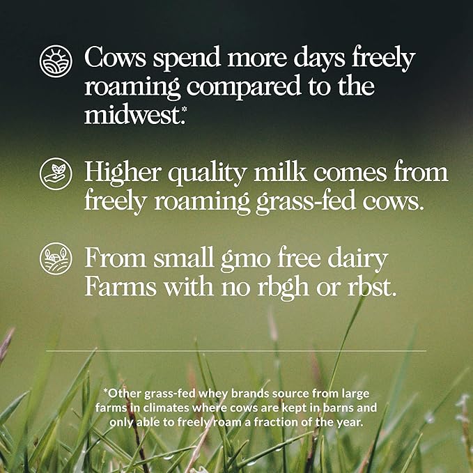 - ALL NATURAL WHEY: Our Chocolate Grass Fed Whey is sourced from small dairy farms in Idaho & Northern California to bring you a non-denatured whey packed full of essential amino acids, clean protein and glutathione.