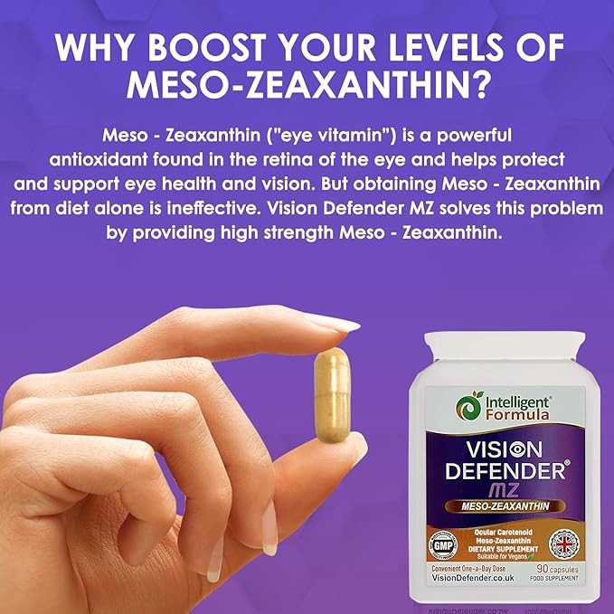- WHY YOU SHOULD BOOST YOUR LEVELS OF MESO-ZEAXANTHIN: Dietary sources of Meso-Zeaxanthin can only be found in small quantities in very specific foods such as shrimp and the skin of certain fish, meaning obtaining Meso-Zeaxanthin from diet alone is ineffective, especially for the elderly where nutrient absorption is inefficient and those who are on a vegan diet. Supplementation with Vision Defender MZ meso zeaxanthin supplement solves this problem, providing optimum strength Meso-Zeaxanthin.