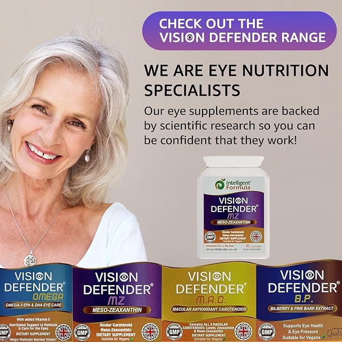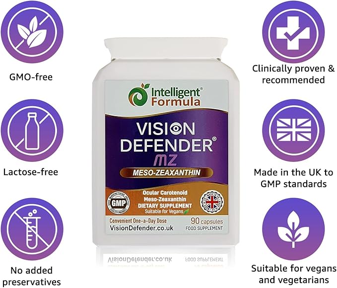 - PREMIUM QUALITY, VEGAN AND VEGETARIAN FRIENDLY – Vision Defender MZ eyesight supplement is made in the UK using top-grade ingredients to strict GMP (Good Manufacturing Practice) standards in MHRA inspected facilities, so you can be assured that this is a superior quality eye supplement. Specially made to be suitable for vegan and vegetarians, all ingredients are from vegetable source and is free from artificial colours, flavours, lactose, gluten and GMO. Cruelty-free: Not tested on animals.