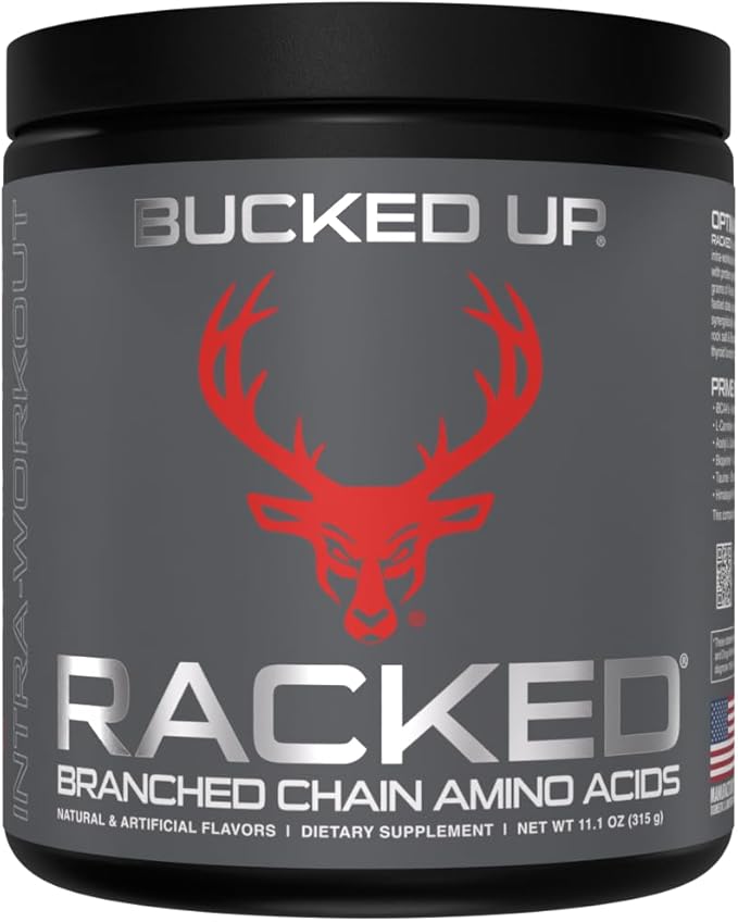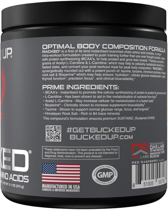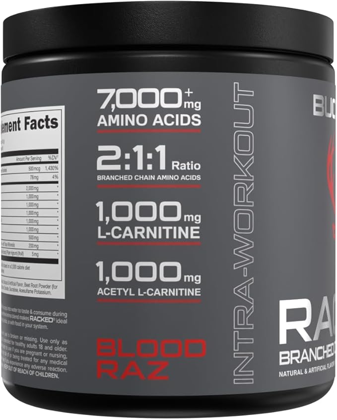 Bucked Up- BCAA RACKED™ Branch Chained Amino Acids | L-Carnitine, Acetyl L-Carnitine, GBB | Post Workout Recovery, Protein Synthesis, Lean Muscle BCAAs That You Can Feel! 30 Servings (Blood Raz)