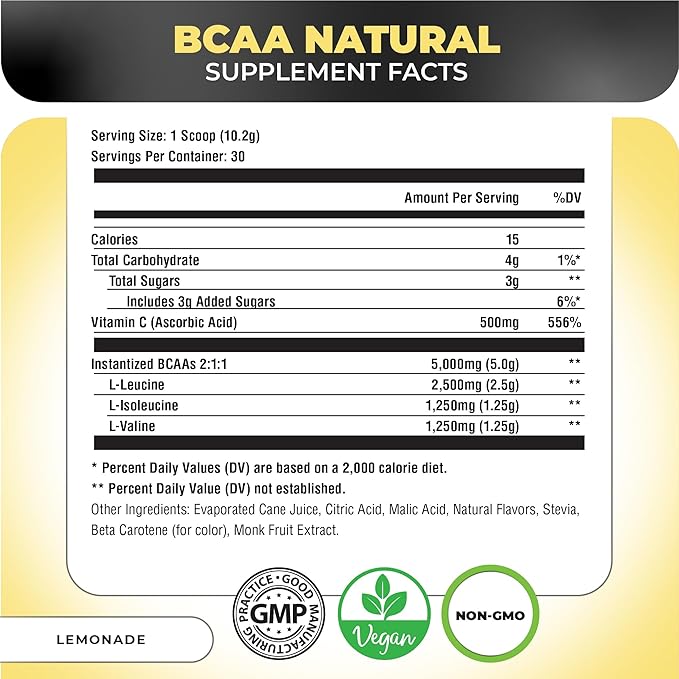 - Branch Chain Amino Acid Supplement: Recovery Drink: Each serving offers 5g of Plant Based BCAAs at the precise 2:1:1 ratio. With 500 mg Vitamin C per scoop our Natural BCAA powder not only supports more chiseled physique but offers an electrolyte boost; promotes immune health.