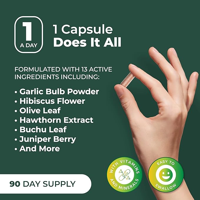 - ALL IN ONE FORMULA: Experience a blend of nutrients in our blood pressure supplements, featuring, hawthorn berry, hibiscus, garlic extract, olive leaf, buchu leaf, uva ursi, juniper berry, green tea, vitamin C, niacin, vitamin B6, folate, and vitamin B12.