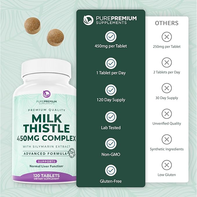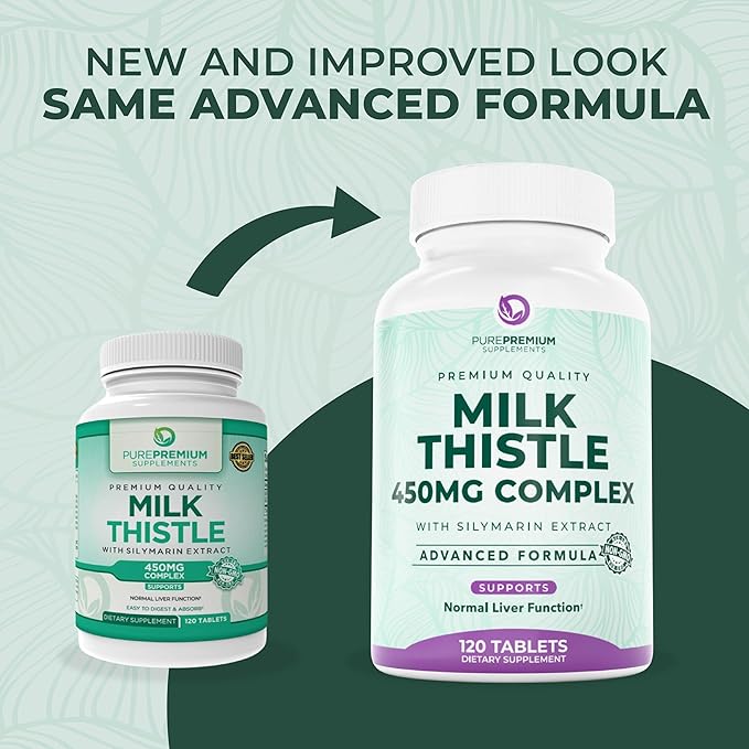 PurePremium Milk Thistle Supplement, 120 Tablets, 80% Silymarin Standardized Extract - High Potency Pure 450mg Complex – Supports Normal Liver Function & Overall Health – Non-GMO, Gluten-Free