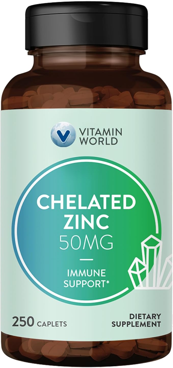 Vitamin World Chelated Zinc 50 mg - 250 Caplets, High Potency & Well Absorbed Chelated Zinc Supplement, Supports Immune, Skin & Antioxidant Health, Gluten-Free, 250 Days Supply