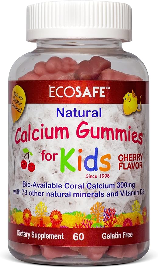 ECO SAFE Coral Calcium Vitamin D3 Kids Gummy, Natural Cherry Flavor, Non GMO, Gluten-Free, Dairy-Free, Soy-Free and Gelatin Free - 300 mg of Calcium, and 800 IU of Vitamin D3-60 Gummies (2 Pack)