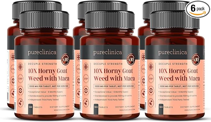 pureclinica 10X Horny Goat Weed Extract (3750mg) Maca Extract (2500mg) x 1080 Tablets (6 Bottles of 180) -10 X More Icariins and Maca