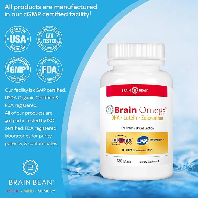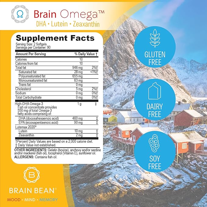 - ๐๐ถ๐ด๐ต ๐ฃ๐ผ๐๐ฒ๐ป๐ฐ๐ ๐ถ๐ป ๐๐๐ฒ๐ฟ๐ ๐ฆ๐ผ๐ณ๐๐ด๐ฒ๐น: Each serving of our soft gel antioxidants supplement provides 1g of high-potency DHA Omega-3 fish oil concentrate, including 460mg of DHA, 90mg of EPA, 10mg of lutein, and 4mg of zeaxanthin for effective support. Our Brain Omega supplements are free from gluten, dairy, and sugar.