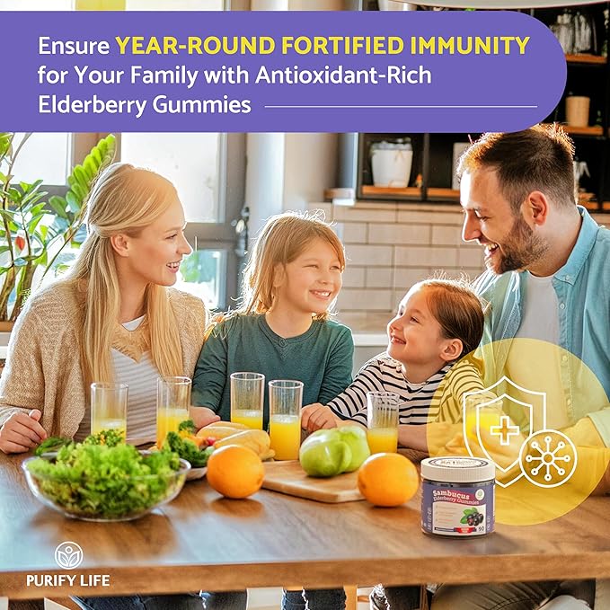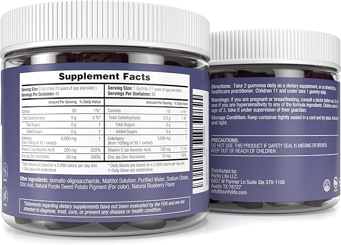 - [Fortified Immune Defense] - Purify Life’s Elderberry gummies are stacked with Zinc and Vitamin C. This immune support supplement promotes immune health through potent antioxidant properties of elderberry and synergistic benefits of zinc and vitamin C, supporting overall immune system function and resilience against seasonal challenges.