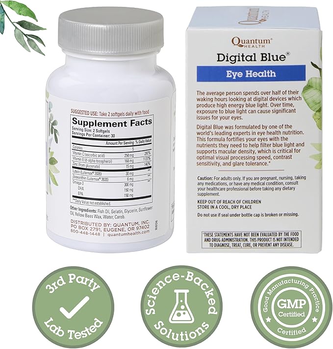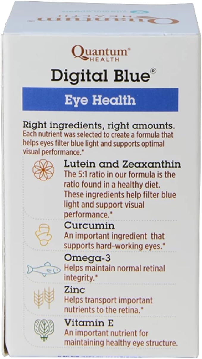 - EASY TO SWALLOW SOFTGELS - Quantum Health Digital Blue softgel eye supplements for adults are specially created for ease of swallowing. 30 servings per bottle, take 2 softgels daily with food. Contains no artificial colors, flavors, wheat, dairy, or corn. Contains gelatin.
