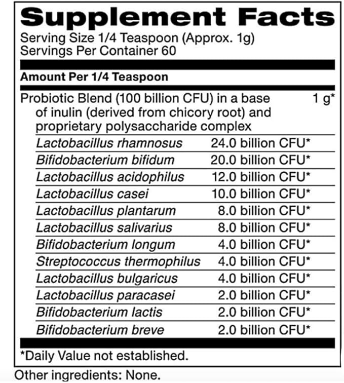 - Active, High Strength, and Hypoallergenic - This men's and women's probiotic powder features a maximum support blend of twelve safe, complementary and well-studied species to support optimal gut flora, immune & GI health. Hypoallergenic 100 billion CFU in a base of chicory-derived prebiotic inulin.*