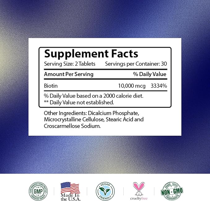 - High potency 10,000 mcg pure Biotin to provide optimal health benefits